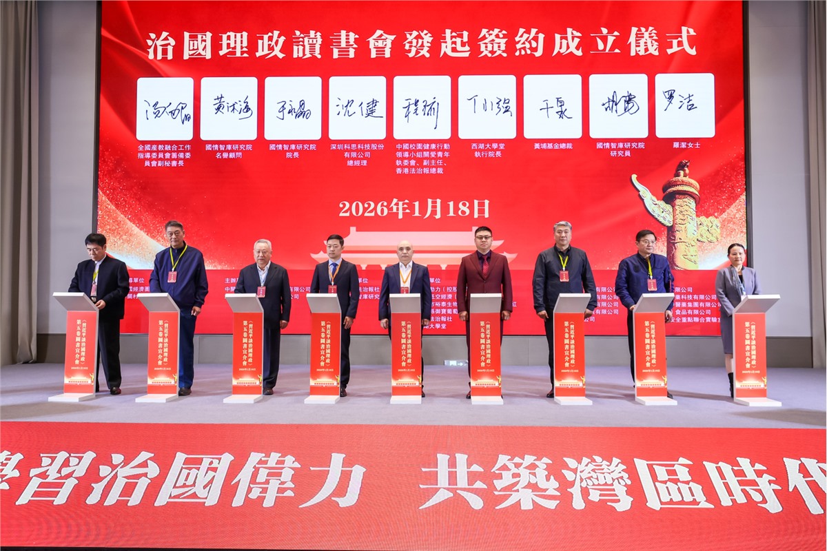 隨後,世界華人協會創會會長程萬琦、中鐵二十五局集團總經理程志強、國情智庫研究院秘書長楊霖、深圳市錦澤慈善基金會執行理事長楊繼慧、中關村金融控股(香港)有限公司總經理張韌、國情智庫研究院副院長李佳洋、等9家單位代表完成「愛國主義讀書會」簽約,袁衛兵、王佐書、張再生等嘉賓見證揭牌。兩大讀書會的成立,為灣區各界持續深學細悟治國理政思想搭建了長效平臺,讓理論學習常態化、制度化。